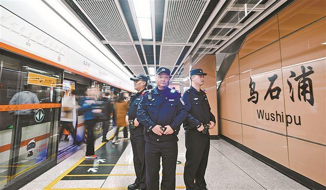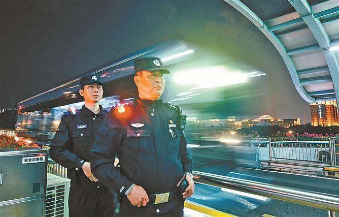 公共交通分局民警在地铁站台亮灯执勤。